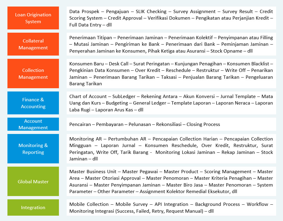 Berikut ini modul-modul ERP yang telah dibangun dan diimplementasi oleh Smartekno pada perusahaan multifinance
