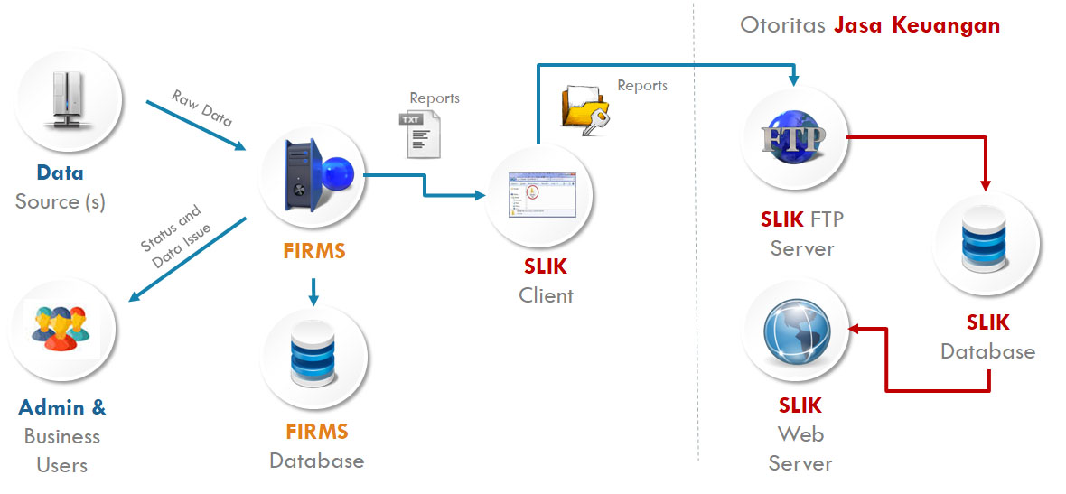 FIRMS memudahkan pengguna dalam melakukan pelaporan informasi debitur ke SLIK OJK. FIRMS dapat secara otomatis mengambil data dari core system untuk kemudian diolah lebih lanjut untuk keperluan pelaporan rutin. FIRMS akan melakukan validasi data untuk memastikan kesesuaian data dan format data sesuai dengan kebutuhan SLIK OJK. Perbaikan data juga dapat dilakukan melalui FIRMS, sebelum data tersebut diperbaiki secara langsung pada core system. Dengan demikian diharapkan pelaporan rutin akan dapat dilakukan secara cepat dan akurat.