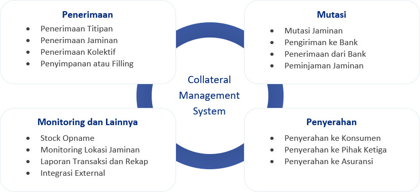 Collateral Management System atau Custodian Management System adalah solusi yang dirancang untuk mengelola asset perusahaan berupa jaminan dari konsumen atas transaksi kredit. Jaminan dapat berupa BPKB kendaraan, sertifikat tanah atau bangunan atau surat berharga. Proses pada CMS dimulai dari pemrosesan penerimaan jaminan dengan verifikasi sesuai produk, proses penyimpanan jaminan ke dalam brankas atau strongroom, transaksi mutasi jaminan yang tervalidasi sesuai ketentuan bisnis, transaksi monitoring rutin dan stock opname, pengelolaan jaminan atas konsumen yang gagal bayar, serta penyerahan jaminan kepada pihak sesuai ketentuan seperti pihak konsumen, pihak asuransi, pihak bank, pihak biro jasa atau pihak ketiga untuk kondisi jaminan yang dijual. Smartekno menyediakan layanan produk Collateral Management System yang sudah jadi ataupun layanan custom development yang menyesuaikan dengan kebutuhan client. CMS dapat diintegrasikan dengan system lainnya yang dimiliki oleh perusahaan, seperti Loan Origination System, Collection Management System, Account Management, Funding Management, Insurance Management, External Management (seperti Biro Jasa, ekspedisi, dll).