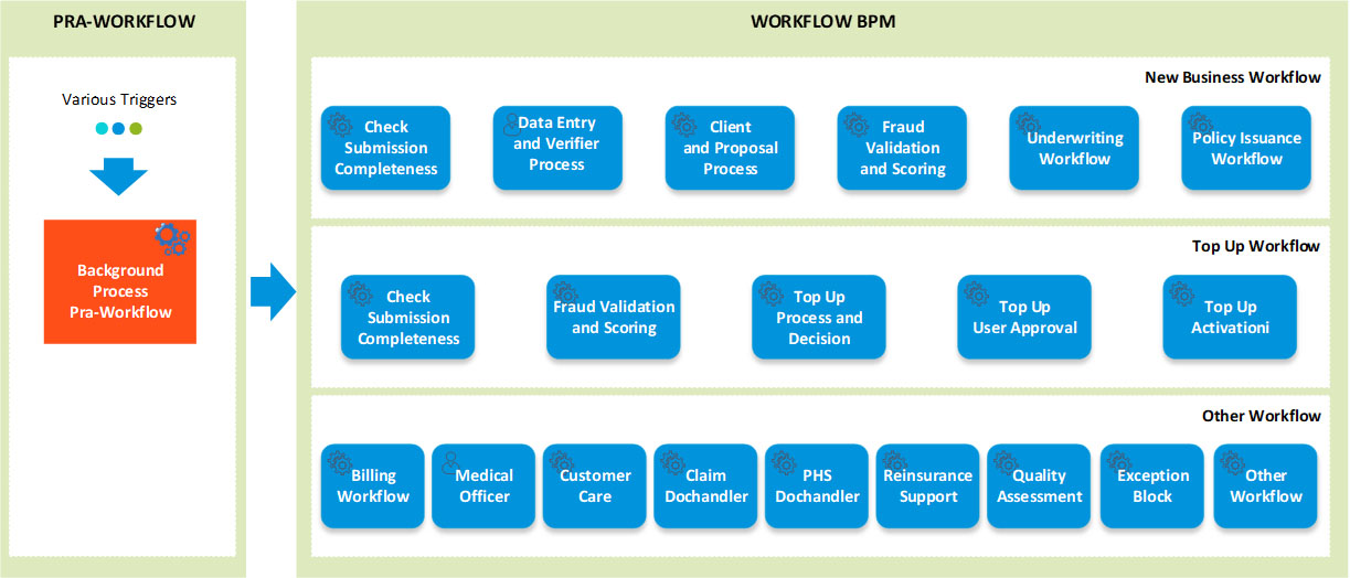 Berikut gambaran singkat workflow insurance yang telah dibangun oleh Smartekno, meliputi proses triggering pra-workflow, Workflow New Business, Top Up Workflow dan Other Workflow seperti Billing Workflow, Medical Officer, Customer Care, Claim Dochandler, PHS Dochandler, Reinsurance Support, Quality Assessment, dll. Terdapat berbagai proses triggering pada pra-workflow yang dihandle oleh background process. Dengan sangat banyaknya transaksi yang diproses setiap harinya, performa sistem adalah hal yang krusial yang menjadi dasar pengembangan sistem.